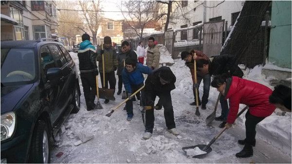 青协长期合作社区---花园社区进行志愿清雪活动。早九点,清雪活动正式开始,志愿者和社区阿姨一起进行清雪工作,铲子,锹,镐齐上阵。艰难的扫雪条件并没有影响志愿者们的热情和工作效率,大家团结协作,顶着寒风,将社区内主要路线的积雪清扫干净。志愿者们热火朝天、干劲十足的扫雪身影也感染了其他人,期间社区内居住的其他学生也加入到清雪队伍中来,其中不乏一名刚上初一的小朋友。