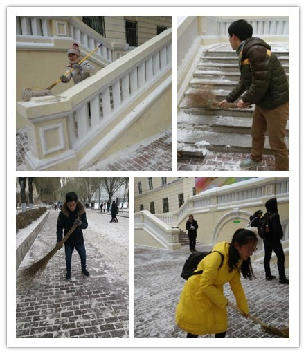 由青协负责人准备好各种扫雪用品,戴好各种保暖用品的志愿者于A04学生社区门前开展清雪活动。在志愿服务过程中,大家首先集中清扫台阶及扶手上的积雪以保证出行的顺畅,后分散开对周围人行道上的积雪积冰进行处理。在服务过程中没人抱怨天气寒冷,积极做好自己的工作,展现了志愿者良好的服务精神和团结意识。在大家的团结协作下,扫雪工作很快完成,得到了社区同学及阿姨的一致好评。