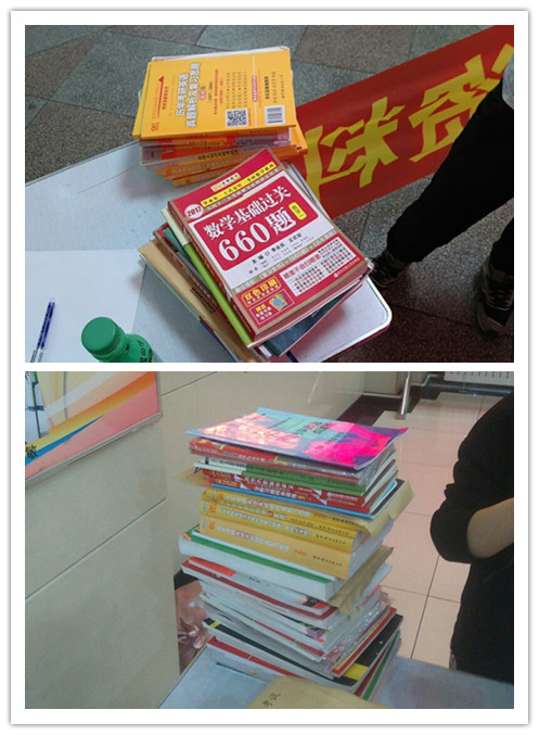 活动当日,“树下老人”考研服务站的志愿者们在各公寓大厅设立了募捐点,学长和学姐们将考研数学习题集、英语练习卷、政治知识要点等一摞摞的考研资料交到志愿者的手中。志愿者进行登记后,将资料送至活动中心434的“树下老人”考研服务站进行分类和整理,供全校学子借阅。