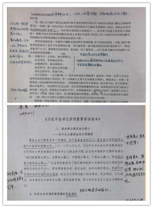 其中,第五组关于《习近平总书记系列重要讲话》中“提高解决改革发展基本问题”交流了体会,刘丹同学在资料中写道:深刻领会中国特色社会主义是党和人民长期实践取得的根本成就,要毫不动摇地坚持和发展中国特色社会主义;第六组关于《习近平总书记系列重要讲话》中“大力推进生态文明建设”进行了分享,秦勇同学在资料中写道:经济的发展促使人们对生态环境建设的理念开始转变,由“盼温饱”转变为“盼环保”,从“求生存”向“求生态”过度;第十一组关于《谈谈辩证法的问题》交流了心得,孙嘉悦同学在资料中写道:辩证法在马克思哲学经典著作中占有极其重要的地位,学习这篇原著对于全面、准确理解唯物辩证法及其方法论有重要的指导意义。