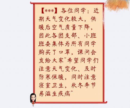 由于入秋以来天气情况多变,尤其在近日供暖后,同学们在早起出门后感觉不适、呼吸不畅。为了鼓励更多同学早起、自习,太阳城网络赌博平台 2016级各团支部、小班班委经过商议,为全年级的每名同学购买医用口罩。10月11日早,各团支部、小班班委代表于第一节课前聚集在致知楼二楼大厅,统一进行分配,于课间下发给同学们。希望同学们能够在每一个清爽的早晨,以崭新的面貌和状态迎接十九大的到来。
