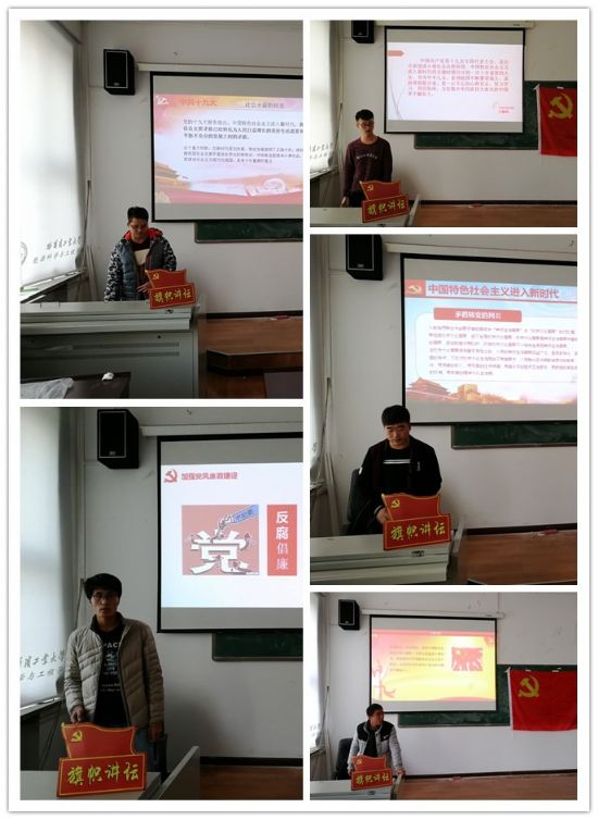 2017年12月11日下午,“旗帜讲坛”第65期在节能楼312会议室举行,由能源学院环境所研究生党支部主办,党支部书记赵文可主持,五位同学担任主讲,环境所党支部学生党员和入党积极分子代表参加了本次活动。