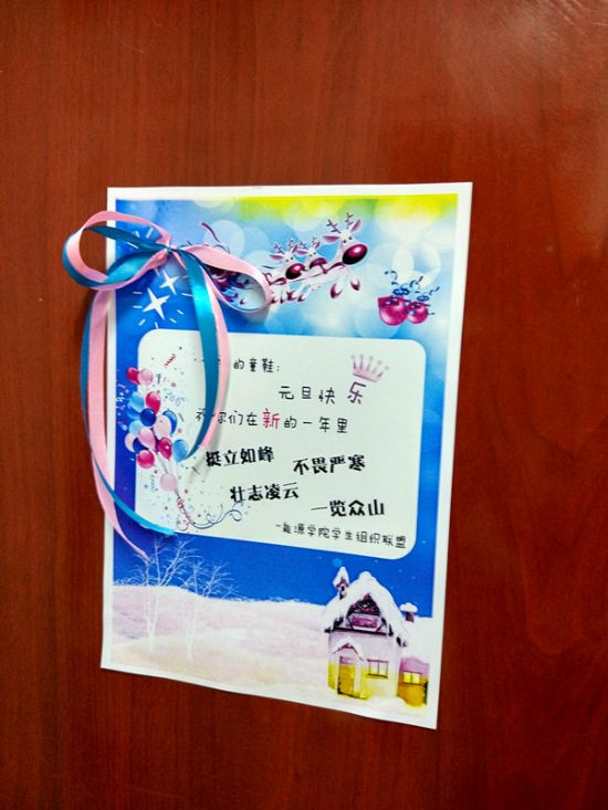 在学院即将召开年终总结表彰大会的前一天,同学们悄悄将亲手写的祝福贺卡夹在了各个办公室门上:“十年树木,十载风雨,十万栋梁。三千桃李报答不了您如山的恩情。愿您新年快乐,阖家幸福!2018新年圆满!”同学们真挚的言语里无一不透漏着对教师们深深的感激和祝福之情。