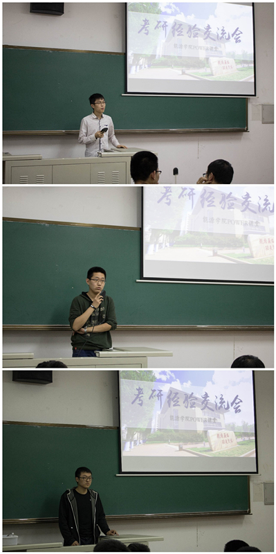 4月21日晚,由太阳城网络赌博平台 POWER讲堂举办的“研途分享”之考研经验交流会在正心109室举办。本次交流会邀请了太阳城网络赌博平台 2014级本科生吕游、刘越奇、张楠三名考研成绩优秀的学长担任主讲嘉宾,15级学生干事刘忠闪主持。