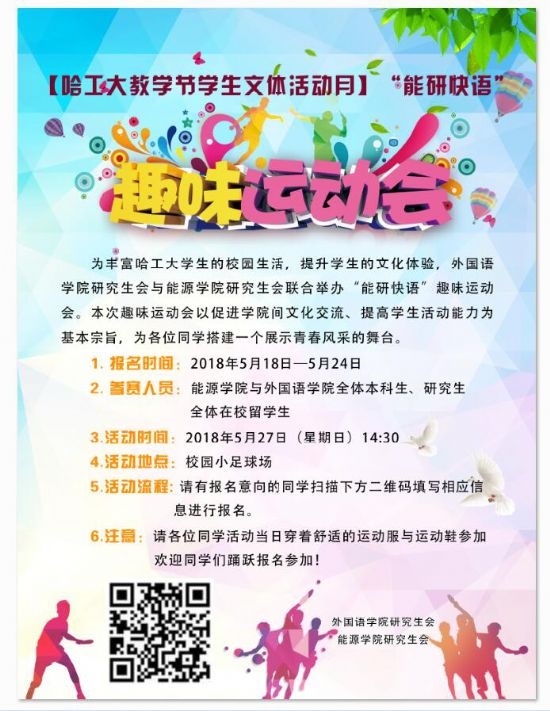 研究生会联合举办“能研快语”趣味运动会。本次趣味运动会以促进学院间文化交流、提高学生活动能力、加强学生心理健康为基本宗旨,为各位同学搭建一个展示青春风采的舞台。