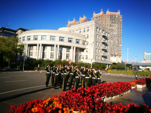 早上7时,国旗护卫队队员迈着矫健整齐的步伐,护卫着五星红旗走向升旗台。旗手们庄重严肃、整齐划一,铿锵的脚步声和激昂的国歌声飘荡在哈工大校园的上空。“起来!不愿做奴隶的人们……”慷慨激昂的国歌响起,升旗手振臂一挥,鲜艳的五星红旗迎风展开,冉冉升起。全体人员肃然而立,向五星红旗敬礼,对伟大祖国致以崇高的敬意和深深的祝福。