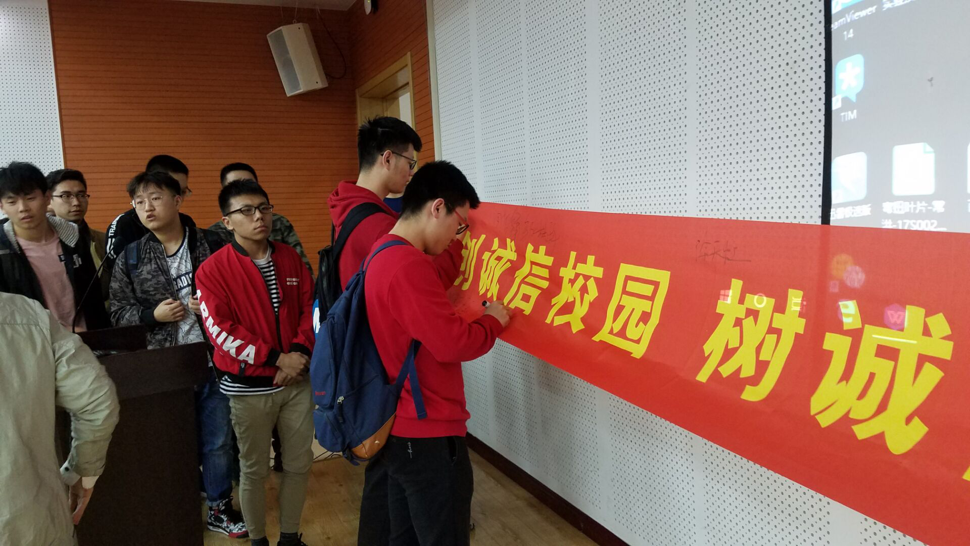 正所谓人无信则不立,国无信则不强,中华民族历来就有“一诺千金”的美德。在本次“诚实笃信,感恩自强 ”诚信教育签名仪式中,每个人都对着自己的拳头许下了誓言,以诚心待人,以诚心待己,以感恩的心待人,以感恩的心待己,并在“创诚信校园,树诚信学风,做诚信学子”的条幅上郑重的签上了自己的名字,许下了庄严的承诺。