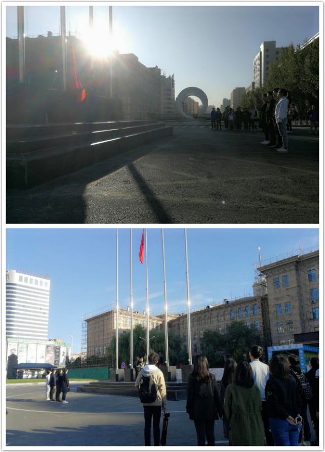 哈尔滨的清晨总是带着些许的凉意,2019年9月20日6点45分,1702403班全体同学便早早的来到了国旗下集合,尽管气温很低,但较低的气温并没有影响到每个同学的热情。同学们整整齐齐地站在电机楼前广场,当升旗手就位后,同学们自发立正。随着义勇军进行曲的播放,升旗手与护旗手迈着铿锵有力的步伐,带着庄严神圣的五星红旗向国旗杆下走去,全场肃静。当义勇军进行曲正式响起时,升旗手带着内心对五星红旗的尊敬与对祖国的热爱扬起手中的五星红旗,同学们每个人都目光严肃、眼神伴随着五星红旗的冉冉升起而升腾温暖。