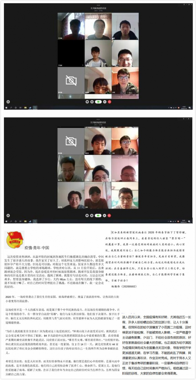 为在建校百年的重要阶段深入推进爱国主义教育,培养堪当大任的新时代青年,贯彻党中央关于新冠肺炎疫情防控各项决策部署,太阳城网络赌博平台 1702402团支部于5月2日下午在线上开展了“疫情·青年·中国——线上思考体悟交流会”团日活动。本次活动由团支书刘子仪主持,支部全体成员参加了本次活动。