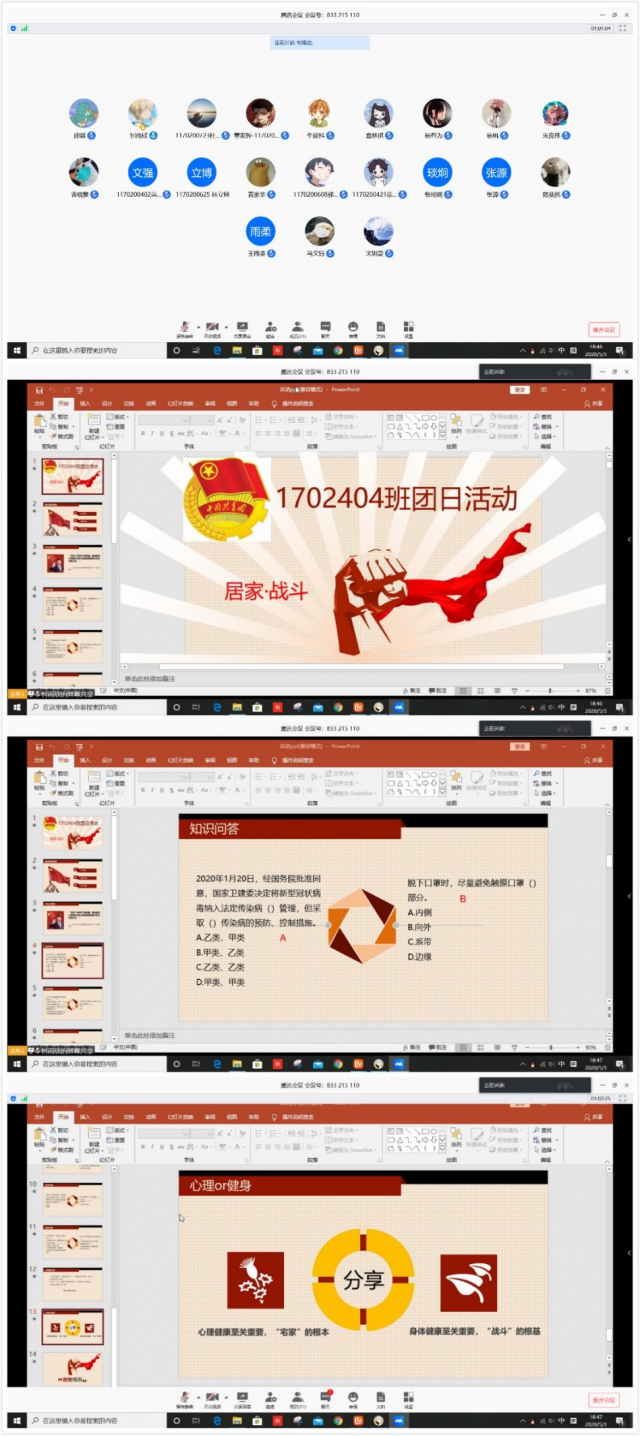 为在建校百年的重要阶段深入推进爱国主义教育,培养堪当大任的新时代青年,贯彻党中央关于新冠肺炎疫情防控各项决策部署,太阳城网络赌博平台 1702404团支部于5月1日举行“居家·战斗·活力”主题团日活动。本次团日活动采取疫情知识问答+小视频分享形式,在腾讯会议平台上进行。
