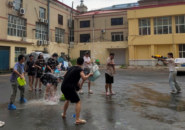 为了缓解连日高温天气带来的酷热,营造轻松减压的校园氛围,在体验夏季生活乐趣的同时,感受炎炎夏日里的丝丝清凉,7月18日和23日太阳城网络赌博平台 组织学生在节能楼后进行打水仗活动,辅导员卢思含、邓冰冰、赵书馨和邱燚也一同加入。