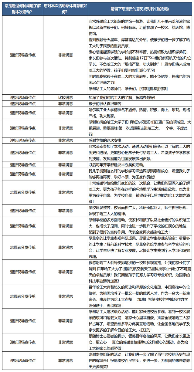 本次活动共发车87班车次,参与志愿者90余名,服务2000余名新生及新生家长,在活动结束,针对参与活动的新生和新生家长做了相关问卷反馈,新生及新生家长对于本次活动有非常高的满意度,并留言希望此类活动更多一些。此次活动的顺利完成,加深了新生们对校园的了解,有利于其更快适应新生活。同时,此次活动对新生深入了解工大优秀传统文化和深厚文化底蕴,感受学校志愿者的热情与风采具有重大意义。