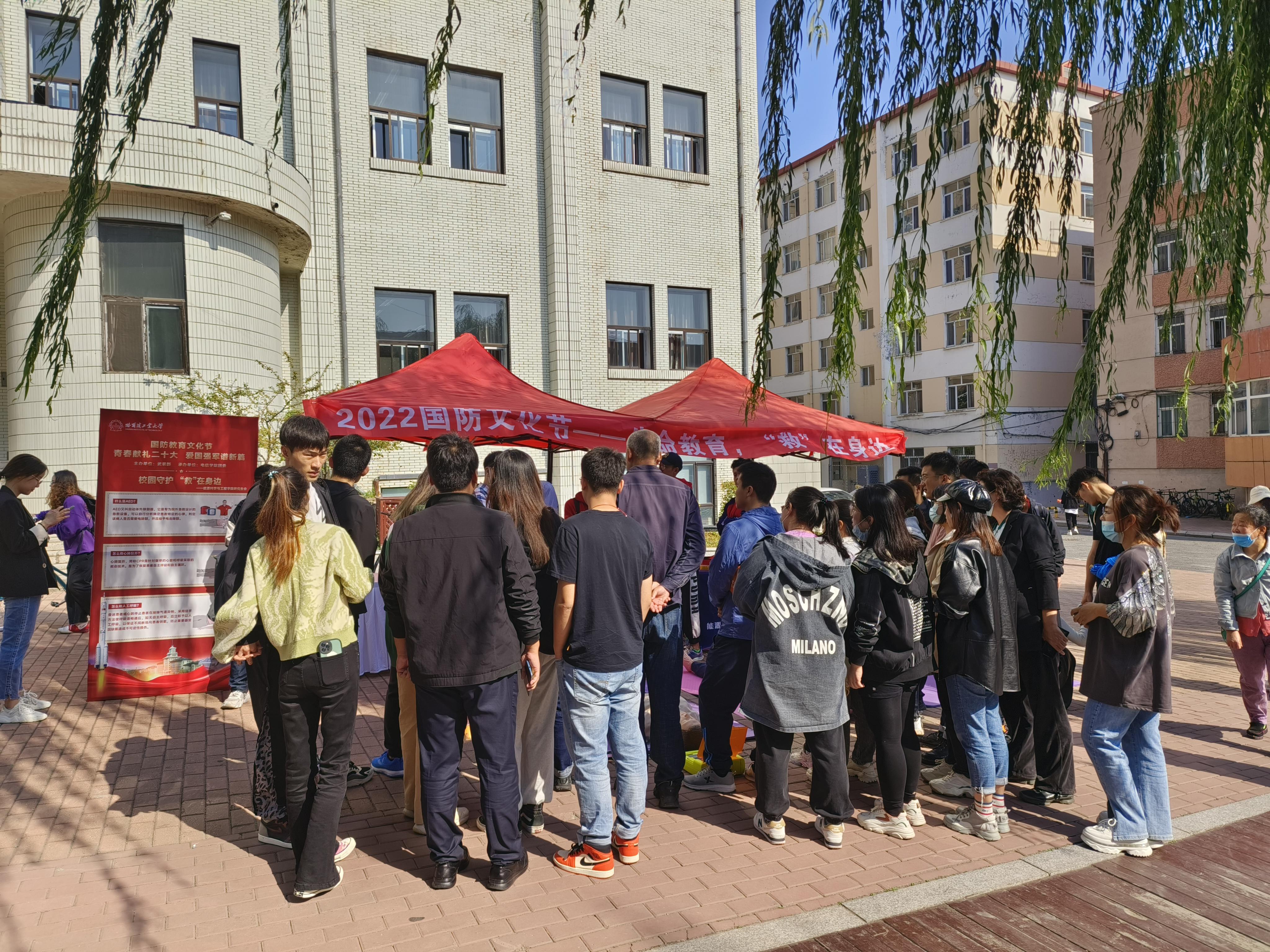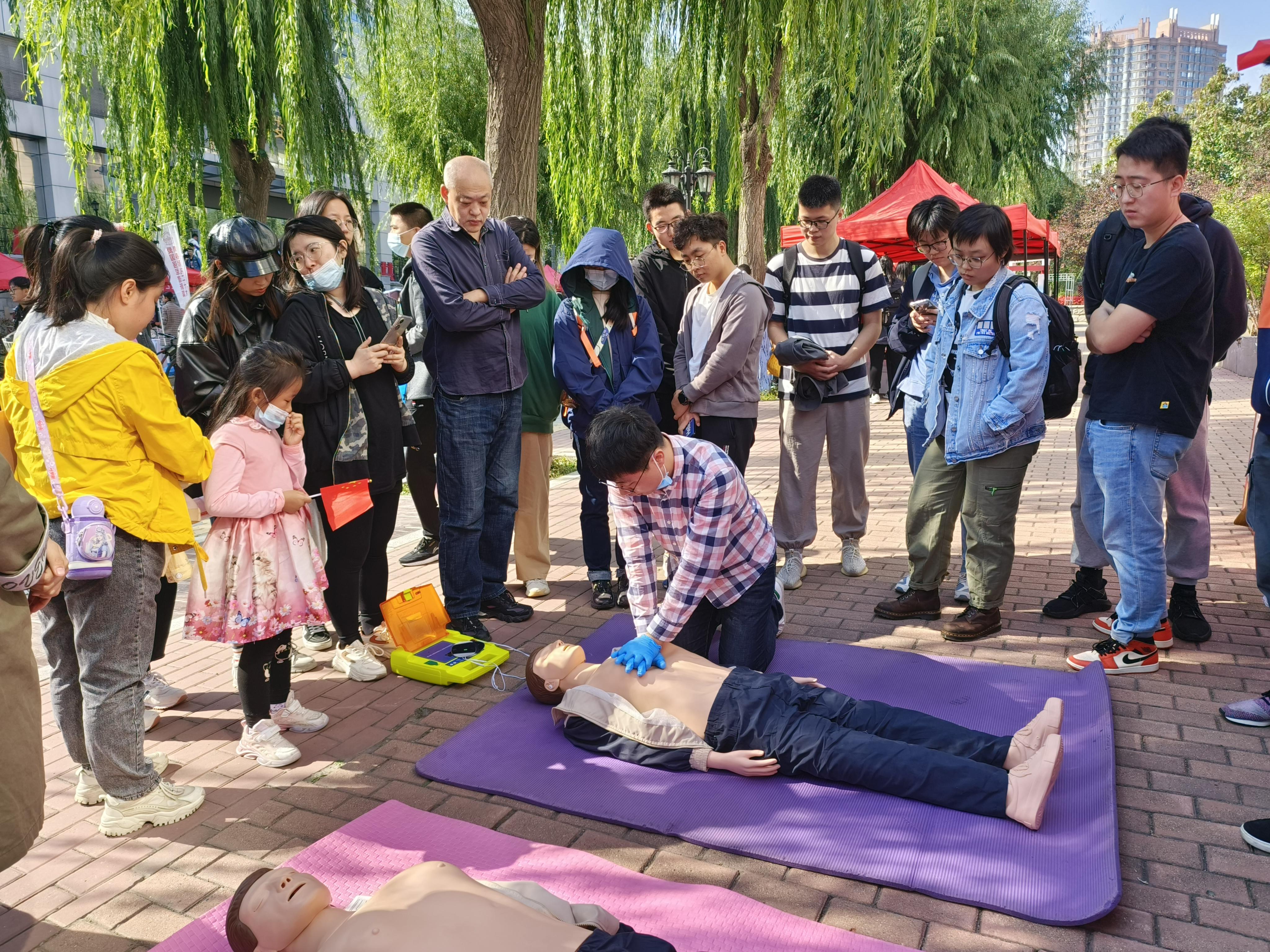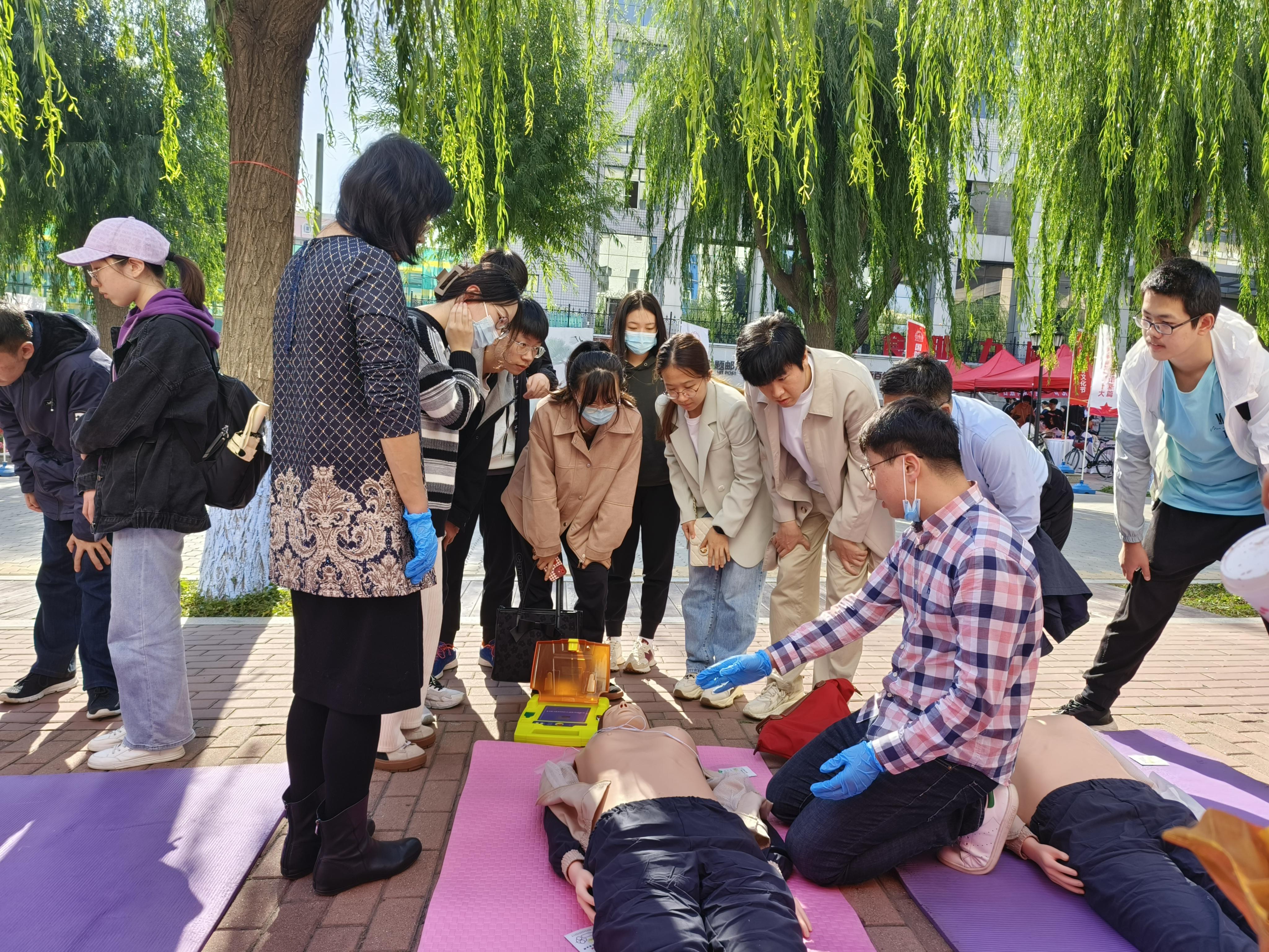 为弘扬爱国主义精神,增强青年学生国防观念,9月27日上午,学校武装部举办以“青春献礼二十大,爱国强军谱新篇”为主题的“国防教育文化节”系列活动,太阳城网络赌博平台 研究生会承接关爱生命,“救”在身边应急救援活动,面向全校师生开展心肺复苏、人工呼吸和AED使用方面的演示和体验,为前来体验的师生进行详细讲解。