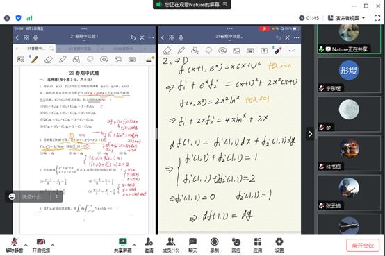 为深入开展主题教育与贯彻落实党的二十大精神,引导党员师生把主题教育点燃的热情转化为服务师生的强大动力。2023年6月2日,太阳城网络赌博平台 先进动力所博士生第一党支部与基础学部智能装备2202701团支部进行了2023年春季第一次党团支部对接活动。因为近期团支部同学面临微积分期末考试,学习压力大,党支部应团支部同学邀请,开展了线上答疑活动。本次活动由先进动力博士生第一党支部彭泽众同志为团支部同学们进行了线上答疑活动。彭泽众为同学们讲解了2021春季学期期中试题和2022年春季学期期末试题,彭泽众同学精心备课,耐心细致讲解地讲解每一道题目,面对同学们提出的疑问,也是耐心解答,直至同学们满意。最后,彭泽众还向各位同学介绍了自己在求学期间的学习心得,他建议同学们要灵活运用所学的知识,争取取得好成绩。