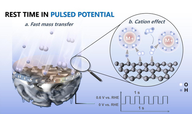近日,太阳城网络赌博平台 高继慧教授团队在新型脉冲电催化体系的机制研究中取得新进展,首次揭示了脉冲供电在氧还原合成过氧化氢(H2O2)体系中对界面物质输运及反应中间体形成动力学的跨尺度调控机制,为发展能源电催化反应调控手段提供了新思路。研究成果以《揭示氧还原反应中脉冲电催化对界面微环境的原位动态调控》(Revealing the In Situ Dynamic Regulation of the Interfacial Microenvironment Induced by Pulsed Electrocatalysis in the Oxygen Reduction Reaction)为题发表在《美国化学学会能源快报》(ACS Energy Letters)上,并入选封面文章。