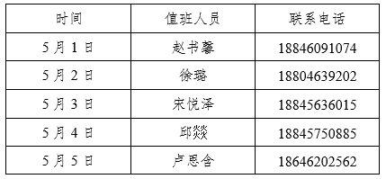 太阳城网络赌博平台 学工办劳动节假期值班表