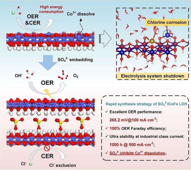 为此,团队开发了一种可行的策略,通过同时氧化硫脲和CoFe来形成插层LDH结构(SO42-/CoFe LDH),实现优异的海水电解性能(265.2 mV@100 mA·cm-2)和卓越的稳定性(1000 h @500 mA·cm-2)。原位拉曼光谱和选区电子衍射结果表明CoFe LDH和SO42-同时生成,并且SO42-会插入LDH层间。层间的SO42-增强了CoFe LDH的OER活性和OH-吸附选择性,抑制了CoFe LDH的腐蚀倾向。DFT计算进一步证实,SO42-的插入抑制了Cl-吸附,并强化了Co-O键的强度。海水AEM电解槽(SO42-/CoFe LDH || Pt/C)实现了高活性(2.264 V@500 mA·cm-2)和稳定运行(150 h@500 mA·cm-2),工作效率高达55.0%,每GGE H2的价格低至1.211美元。